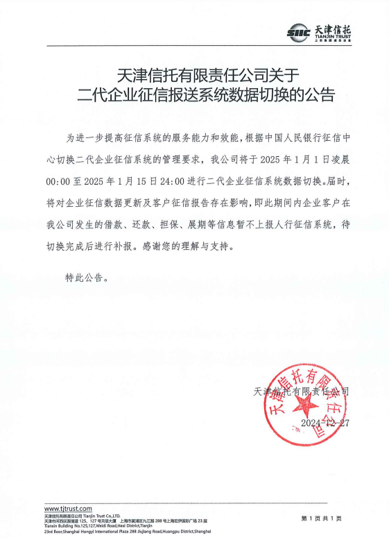 天津信托有限責(zé)任公司關(guān)于二代企業(yè)征信報(bào)送系統(tǒng)數(shù)據(jù)切換的公告