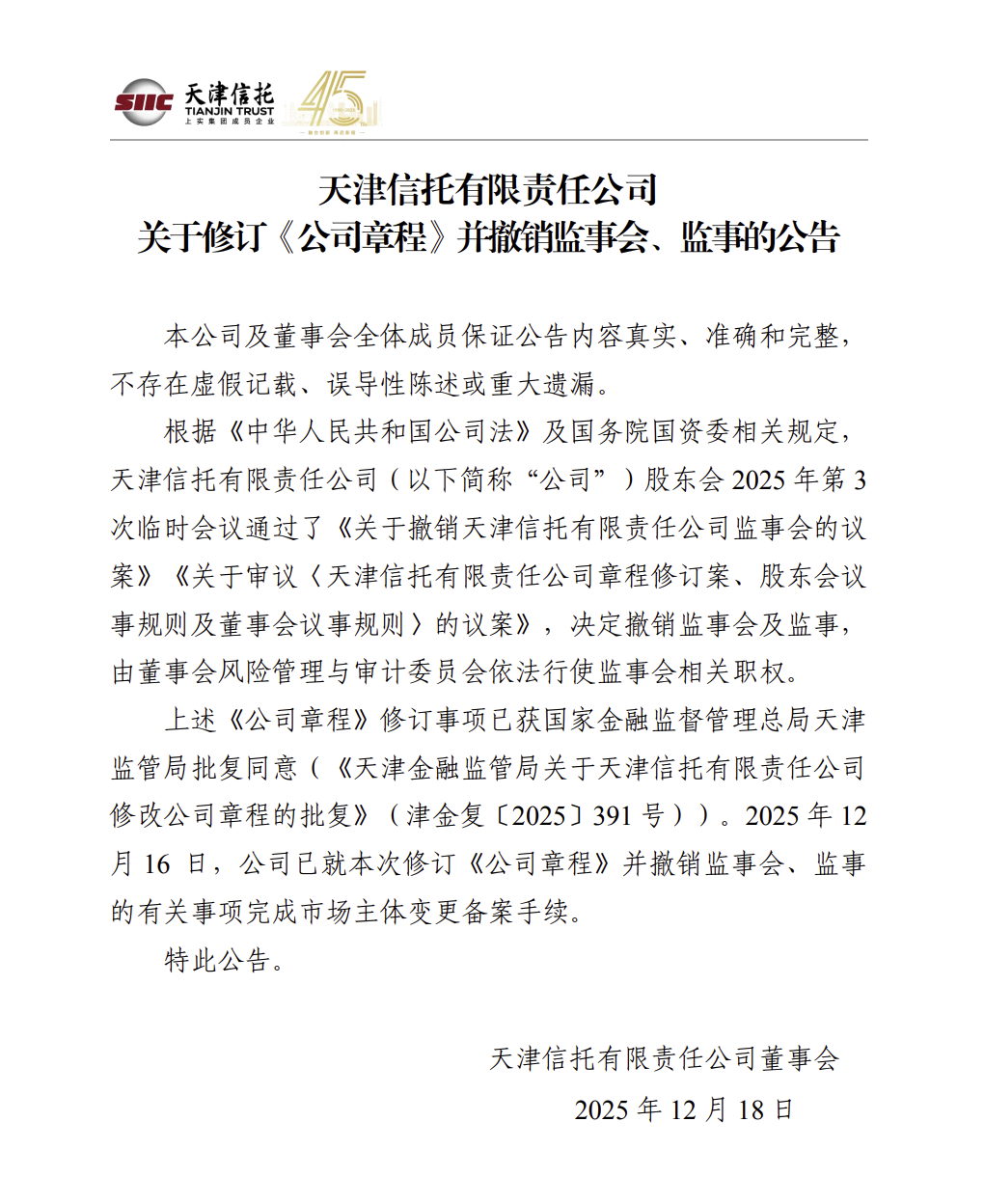 天津信托有限責(zé)任公司關(guān)于修改《公司章程》并撤銷(xiāo)監(jiān)事會(huì)、監(jiān)事的公告