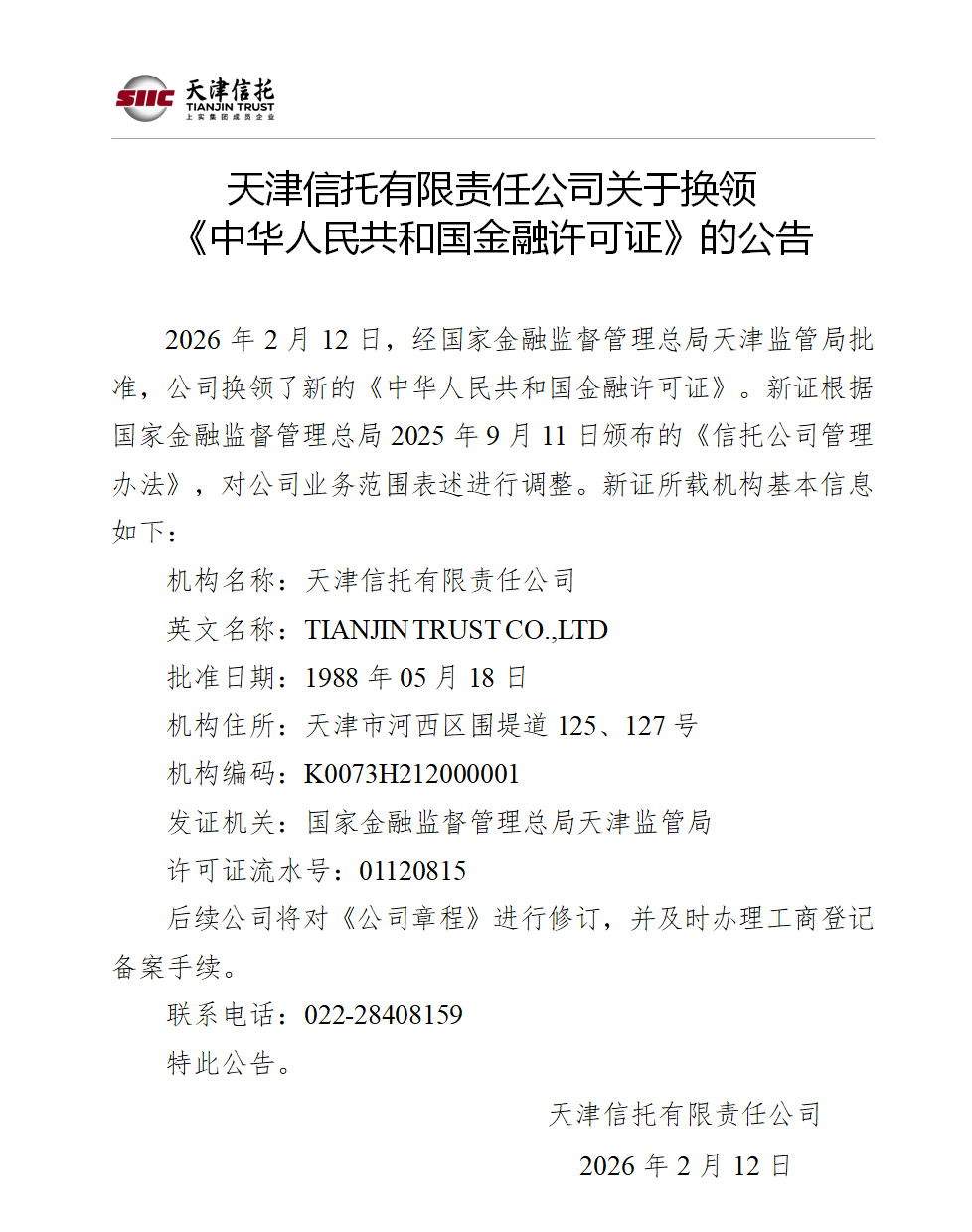 天津信托有限責(zé)任公司關(guān)于換領(lǐng) 《中華人民共和國(guó)金融許可證》的公告