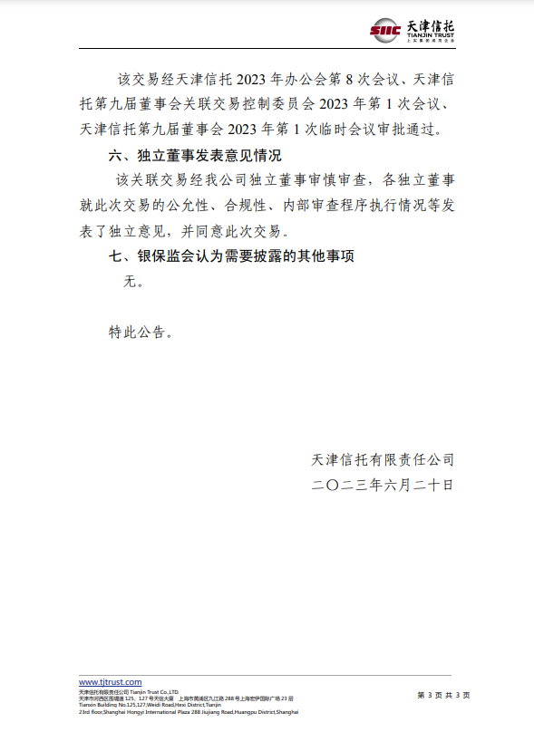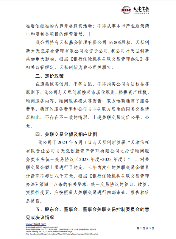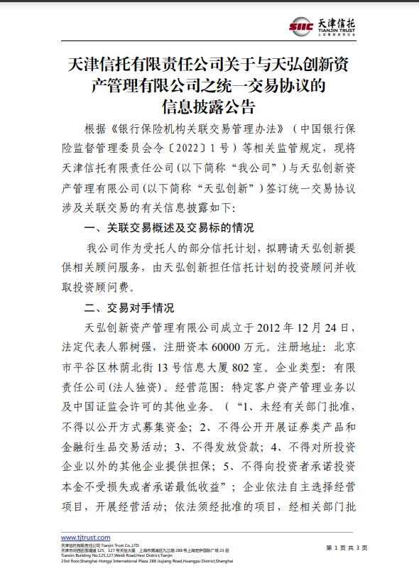 天津信托有限責(zé)任公司關(guān)于與天弘創(chuàng)新資產(chǎn)管理有限公司之統(tǒng)一交易協(xié)議的信息披露公告
