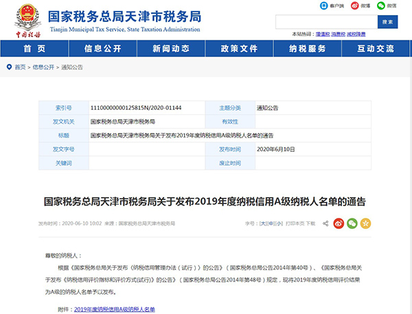 2020年6月,天津市國(guó)家稅務(wù)局網(wǎng)站公布了2019年度納稅信用評(píng)價(jià)結(jié)果為A的納稅人名單,天津信托連續(xù)第8年被評(píng)為A級(jí)納稅人。