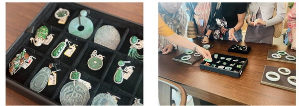 活動中,國盛典當(dāng)行特邀講師繆嘉懿老師與嘉賓分享有關(guān)珠寶鑒賞要點,以及如何挑選、辨別珠寶等知識,并帶來實物翡翠手鐲、戒指等玉石,讓到場嘉賓在學(xué)習(xí)理論知識后,通過實物來進一步了解如何鑒賞玉石?;顒蝇F(xiàn)場氣氛十分活躍,嘉賓們也帶來了自己的收藏品與老師溝通交流。