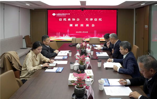 2024年11月24日上午,中國(guó)信托業(yè)協(xié)會(huì)黨委書記、專職副會(huì)長(zhǎng)(常務(wù))劉峰,會(huì)員維權(quán)與服務(wù)部副主任孫琳一行來(lái)天津信托調(diào)研座談。天津信托黨委書記、董事長(zhǎng)周雄主持座談會(huì),總經(jīng)理黎代福,常務(wù)副總經(jīng)理(擬任)梁俊雄,業(yè)務(wù)總監(jiān)楊海軍等參加調(diào)研。